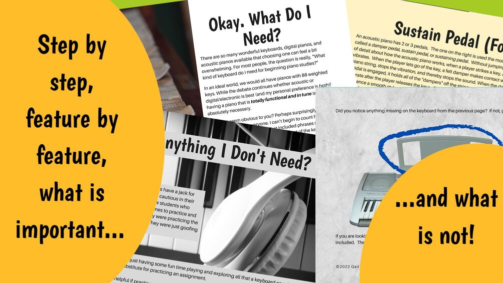 Ready to start piano lessons? Looking for a keyboard but don't know what to get? This short, concise eBook will answer all your fundamental questions about what things you need on a keyboard and why you need them! There's no sales talk, just real, practical information. It doesn't matter whether you are looking at keyboards that are new or used, expensive or budget-friendly, you will still need certain critical features for beginning piano studies. Just as it is important to know what is necessary, we will also talk about what is not! Let Gail Masinda, a music teacher with over 50 years in the music industry guide you to get the best instrument possible for your beginning piano studies.